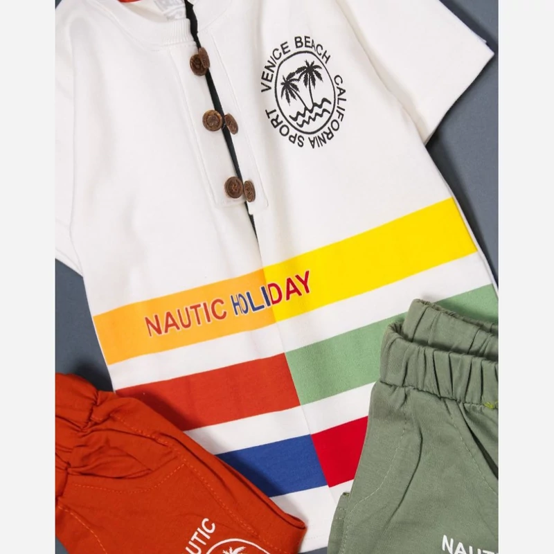 ست دو تیکه تیشرت شلوارک پسرانه دخترانه یقه کوبایی اسپرت